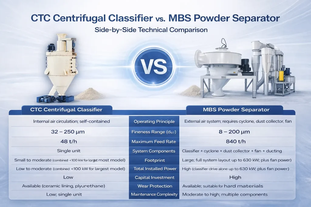 Para selecionar o classificador apropriado para sua operação GCC, você precisará definir cinco parâmetros principais. O primeiro é precisão alvoSe você precisa de partículas de 32 a 250 mícrons, o CTC é adequado; se precisa de partículas de 8 a 32 mícrons, o MBS é a escolha certa. Em segundo lugar... capacidade horáriaPara produções inferiores a 50 toneladas por hora, o CTC pode ser suficiente para produtos de granulometria grossa, enquanto o MBS oferece modelos maiores, com capacidade de até 840 toneladas por hora, para maior produtividade. Terceiro é integração com equipamentos existentesO CTC funciona bem como um sistema independente, enquanto o MBS é o padrão para sistemas de circuito fechado de moinhos de bolas.