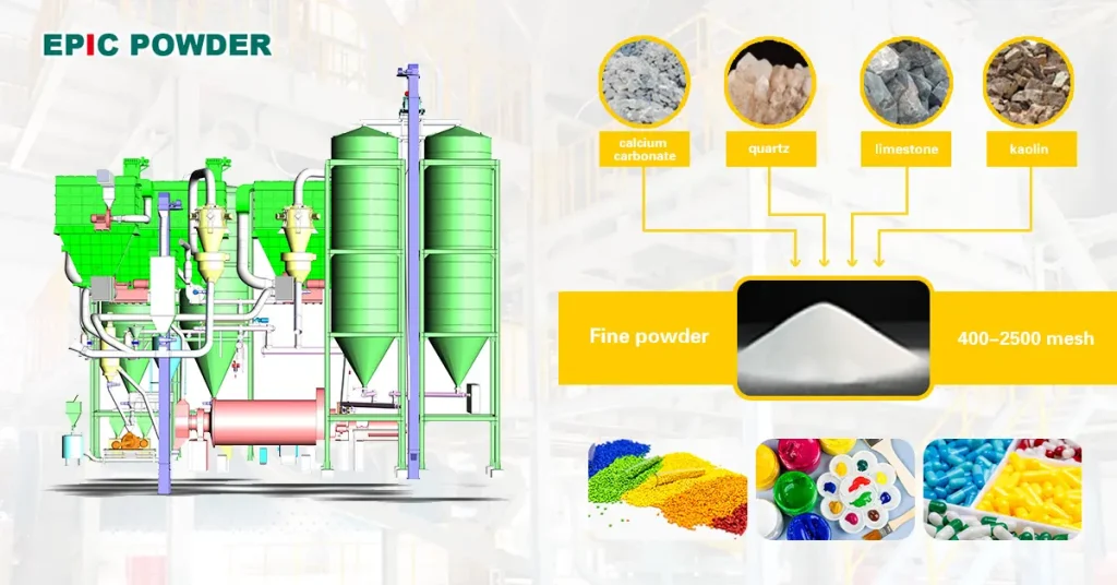 Для лучшего оборудования для переработки карбоната кальция, включая системы измельчения, шаровые мельницы, валковые мельницы, штифтовые мельницы, машины для нанесения покрытий и сверхтонкие воздушные сепараторы, рассмотрите Эпический порошок Machinery — лидер в области инновационных решений в области порошковых технологий. Свяжитесь с нами сегодня, если у вас есть вопросы о нашей продукции.